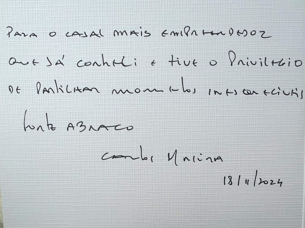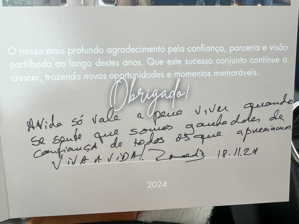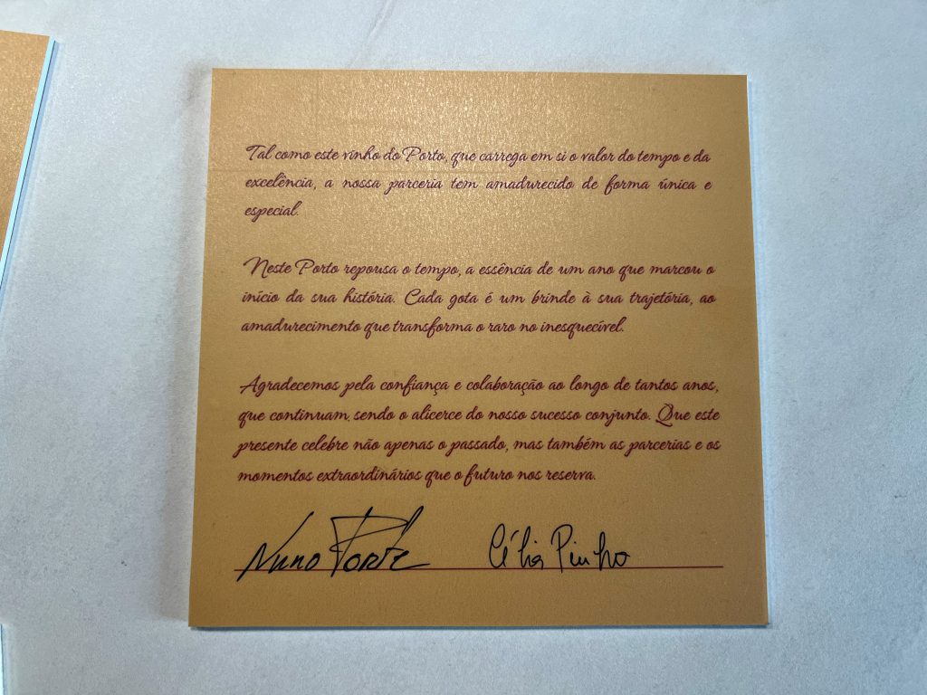 Num gesto cheio de significado, Nuno Forte e Célia Pinho presentearam cada um dos representantes da Guess com um livro de memórias da parceria, simbolizando os marcos alcançados juntos. Além disso, surpreenderam-nos com garrafas de vinho do Porto do ano de nascimento de cada um. Este detalhe tocou profundamente os convidados, que fizeram questão de escrever dedicatórias emocionadas em agradecimento.